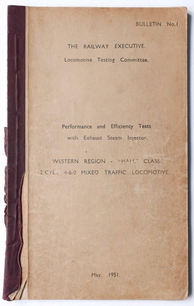 105 | Railway Executive foolscap sized document. ‘Performance and Efficiency Tests Hall Class Locomotives’. 30+ typescript pages and tables, dated May 1951. | £26 |  |