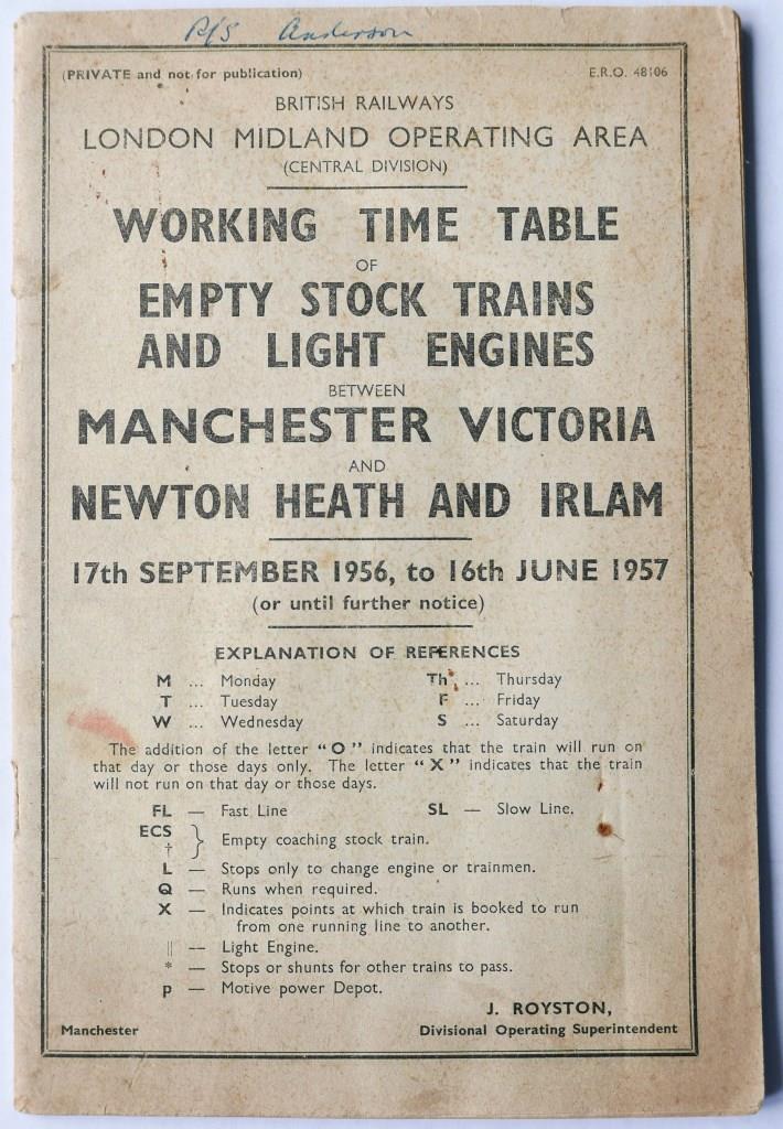 121 | BR(M) Central Division working timetable of Empty Stock Trains and Light Engines between Manchester Victoria and Newton Heath & Irlam. 63pp dated September 1956. Slight foxing to covers. | £70 |  |