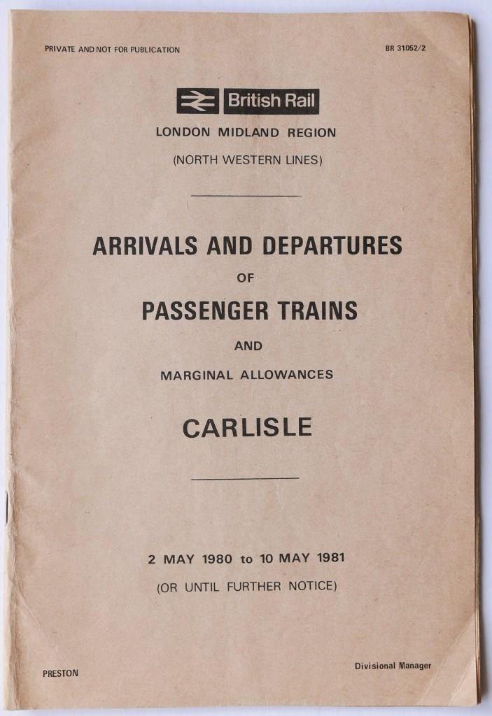 124 | BR(M) North Western Lines booklet ‘Arrivals and Departures of Passenger Trains and Marginal Allowances at Carlisle’. 35pp dated May 1980. Ink amendments. | £4 |  |