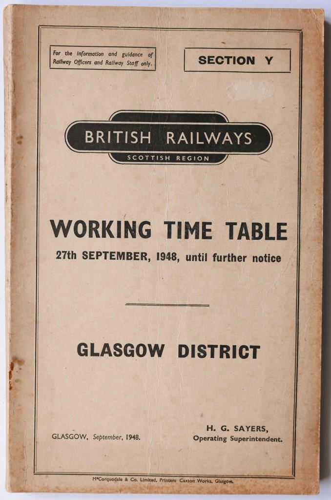 128 | BR(ScR) section Y working timetable Glasgow District. 221pp dated September 1948. | £30 |  |