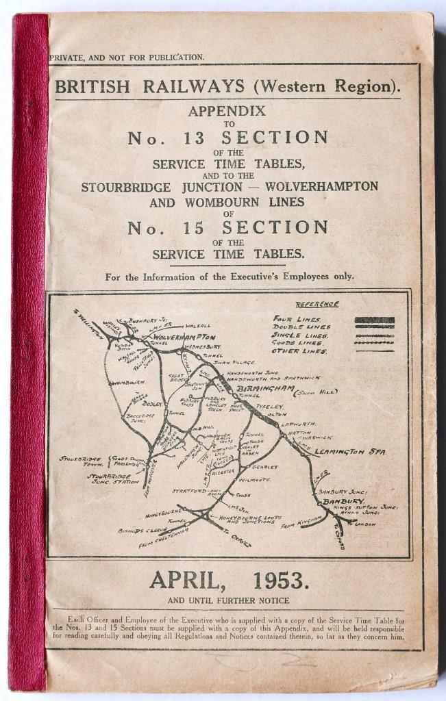 133 | BR(W) appendix to No.13 section and Stourbridge Junction and Wolverhampton Line of No.15 section of the service timetables. 199pp dated April 1953. | £11 |  |