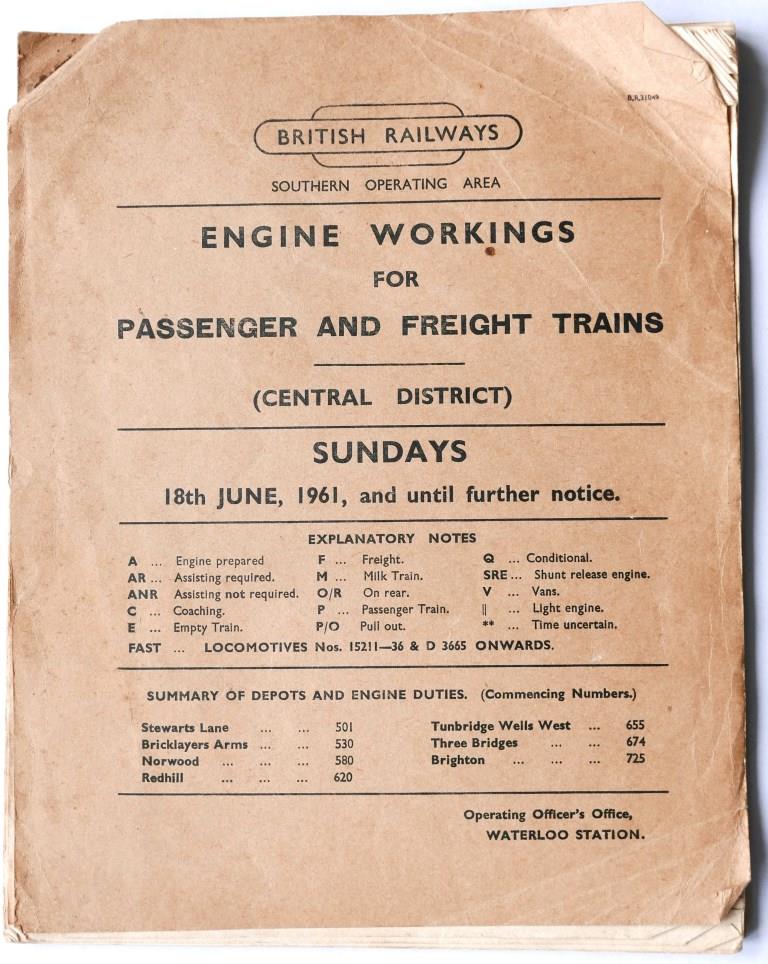 144 | BR(S) Central District booklet ‘Engine Workings for Passenger and Freight Trains – Sundays’. Card covers, 42pp, dated September 1960. | £5 |  |