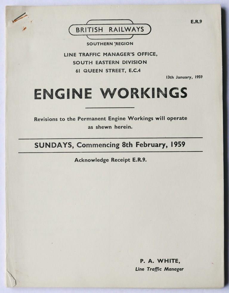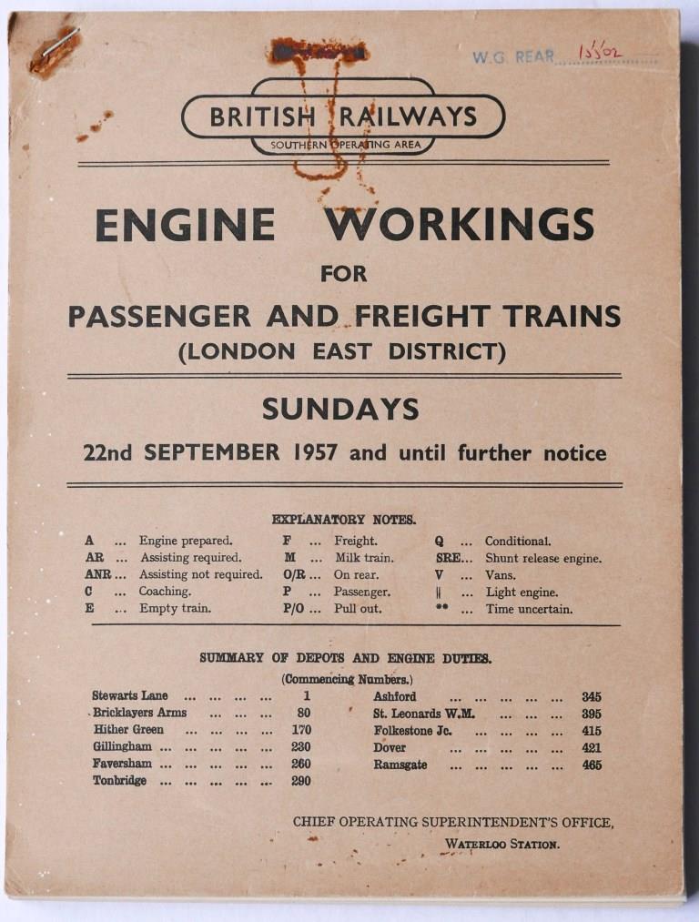 146 | BR(S) London East District booklet ‘Engine Workings for Passenger and Freight Trains – Sundays’. Card covers, 63pp, dated September 1957. | £5 |  |