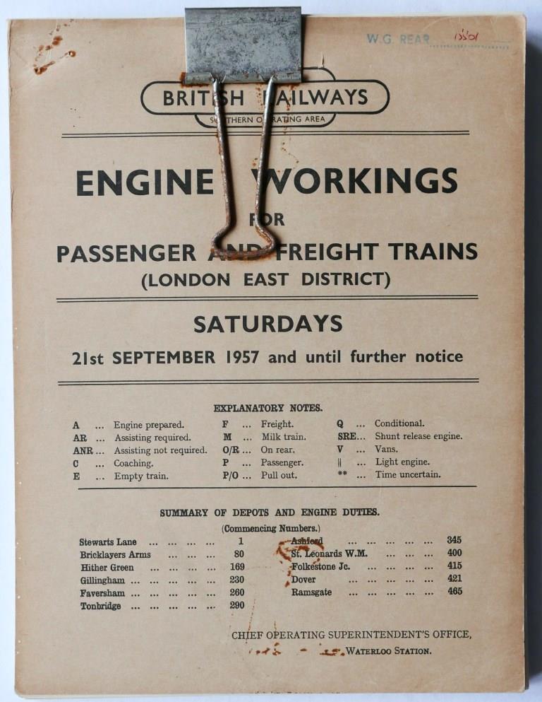 147 | BR(S) London East District booklet ‘Engine Workings for Passenger and Freight Trains – Saturdays’. Card covers, 134pp held by bulldog clip, dated September 1957. | £5 |  |