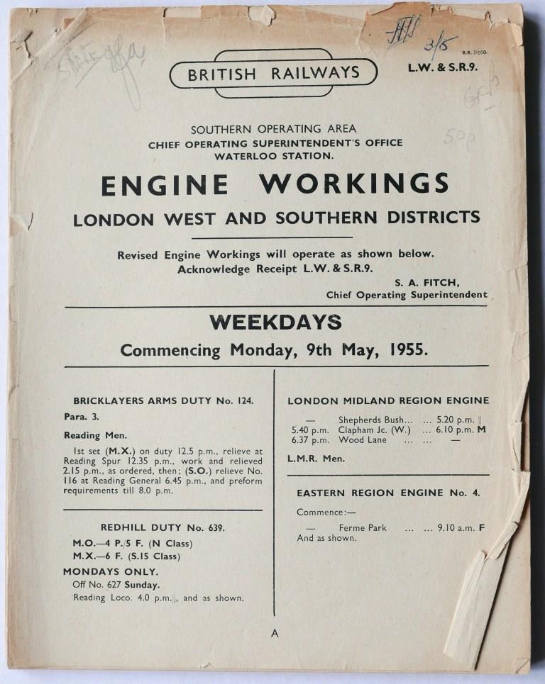 145 | BR(S) Central District booklet ‘Engine Workings for Passenger and Freight Trains – Weekdays’. Card covers, 136pp held by bulldog clip, dated December 1955. Rear cover missing, some wear, amendments added. | £65 |  |