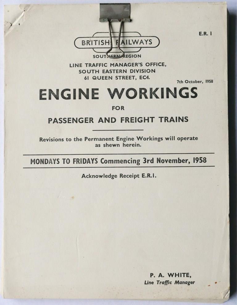 138 | BR(S) Central District booklet ‘Engine Workings for Passenger and Freight Trains – Saturdays’. Card covers, 115pp, dated June 1958. | £5 |  |