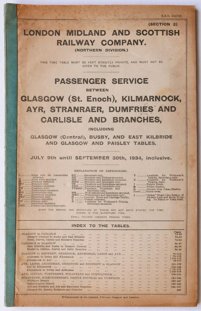 129 | BR(ScR) section 3 working timetable of passenger trains between Glasgow (St.Enoch), Kilmarnock, Ayr, Stranraer, Dumfries and Carlisle and branches. 57pp, dated May 1949. | £24 |  |