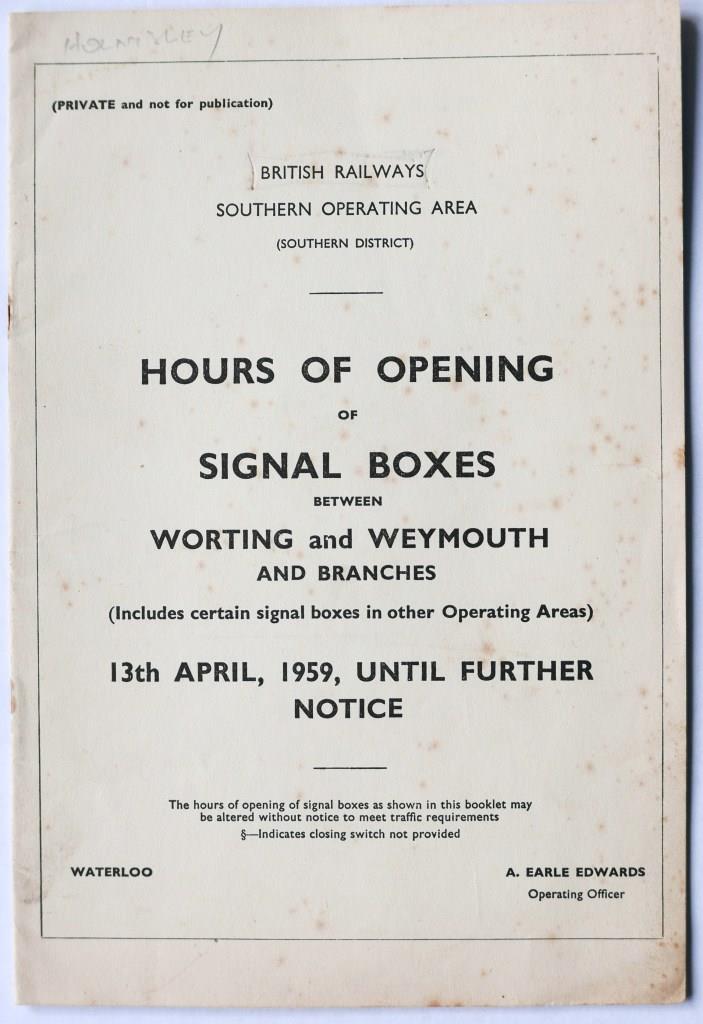 50 | BR(S) Southern District booklet ’Hours of Opening of Signalboxes between Worting Junction and Weymouth and branches’. 11pp dated April 1959. | £20 |  |
