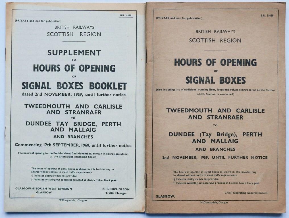 52 | BR(ScR) booklet ‘Hours of Opening of Signal Boxes Tweedmouth, Carlisle & Stranraer to Dundee Tay Bridge, Perth & Mallaig’. 81pp dated November 1959. Plus 15pp supplement dated September 1960. | £32 |  |