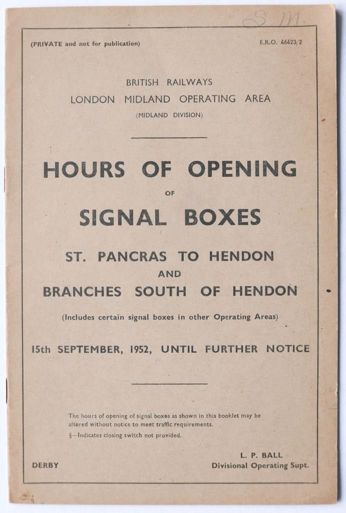 53 | BR(NE) booklet ‘Hours of Opening of Signal Boxes in the London Midland Operating Area’. 64pp dated September 1957. | £22 |  |