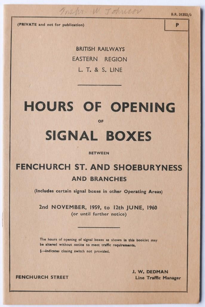 58 | BR(E) LT&S Line booklet ‘Hours of Opening of Signal Boxes between Fenchurch St and Shoeburyness and branches’. 11pp dated November 1959. | £32 |  |