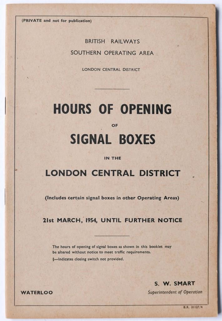 59 | BR(S) booklet ‘Hours of Opening of Signal Boxes in the London Central District’. 23pp dated March 1954. Amendments added. | £16 |  |
