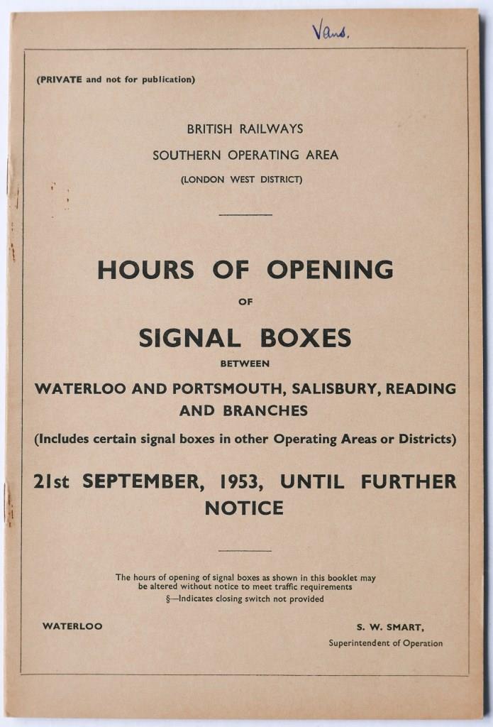 61 | BR(S) London West District booklet ‘Hours of Opening of Signal Boxes between Waterloo and Portsmouth, Salisbury, Reading and branches’. 16pp dated September 1953. | £36 |  |