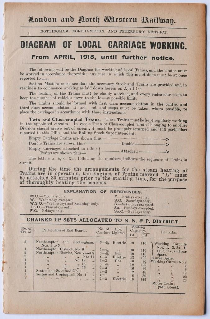 632 | LNWR Nottingham, Northampton and Peterboro’ District ’Diagram of Local Carriage Working’ dated April 1915. 14pp, disbound. | £55 |  |