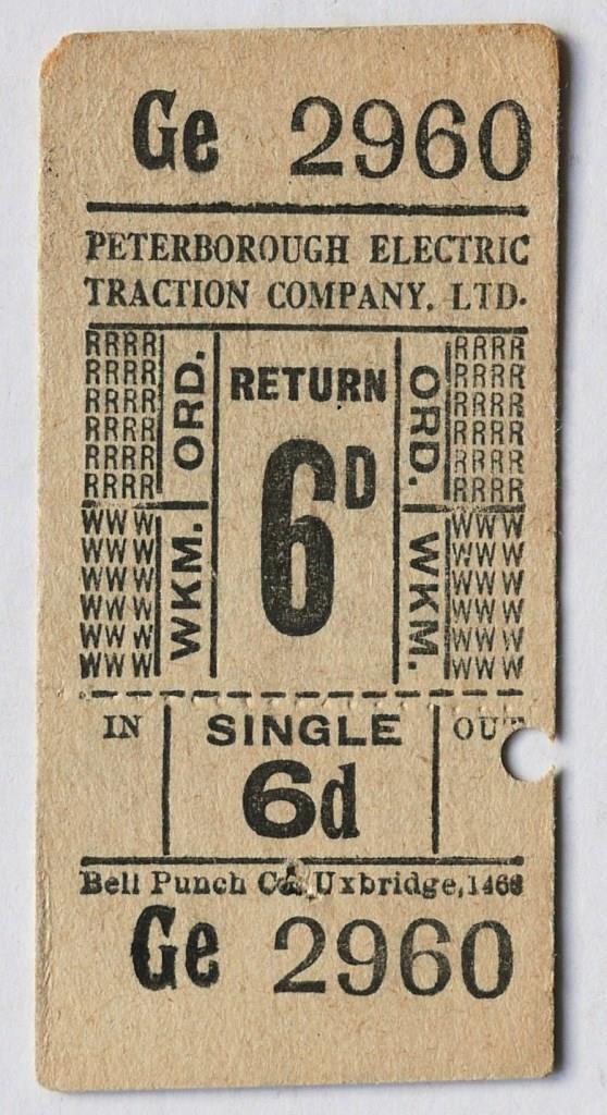 700 | Peterborough Electric Traction Co 6d numerical punch type ticket. | £11 |  |