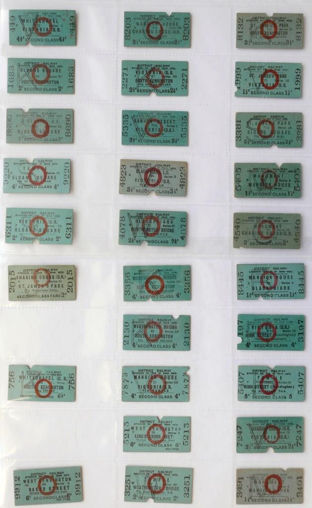 726 | Approx 70 District Railway whole Edmondson tickets. All on blue coloured card and with red ‘O’ overprint. Most issued. Back damage and creasing to a few. | £36 |  |