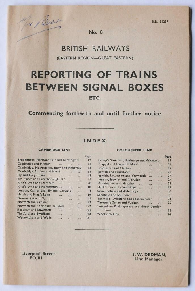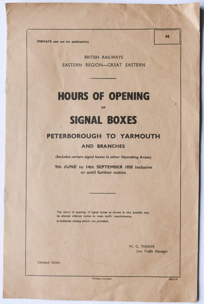 80 | BR(E) booklet ‘Hours of Opening Signal Boxes Peterborough to Yarmouth & branches’. 7pp dated June 1958. | £10 |  |