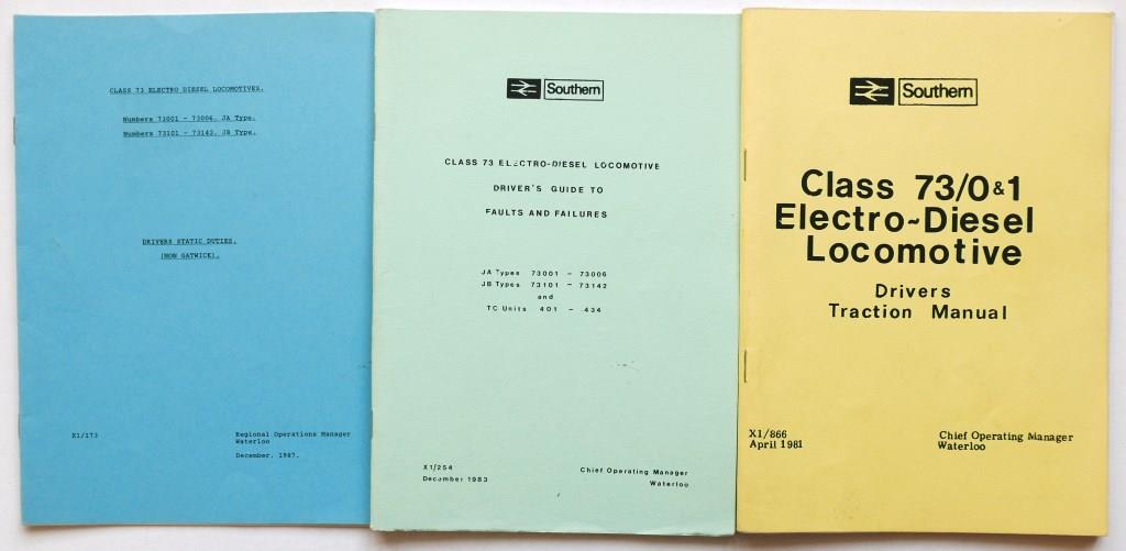 83 | 3 BR manuals relating to the operation of class 73 electro diesel locos including Drivers Static Duties (11pp, 1987), Guide to Faults and Failures (55pp, 1983, ink amendments), Drivers Traction Manual (74pp, 1981, ink amendments). | £15 |  |