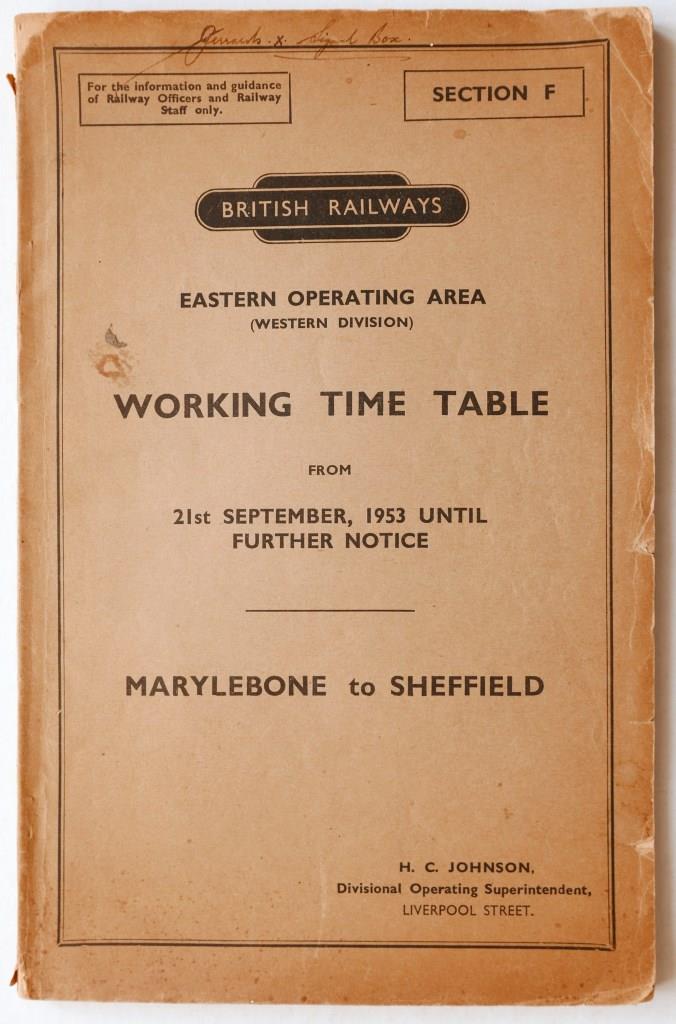 91 | BR(E) Western Division section F working timetable Marylebone to Sheffield. 141pp dated September 1953. | £24 |  |