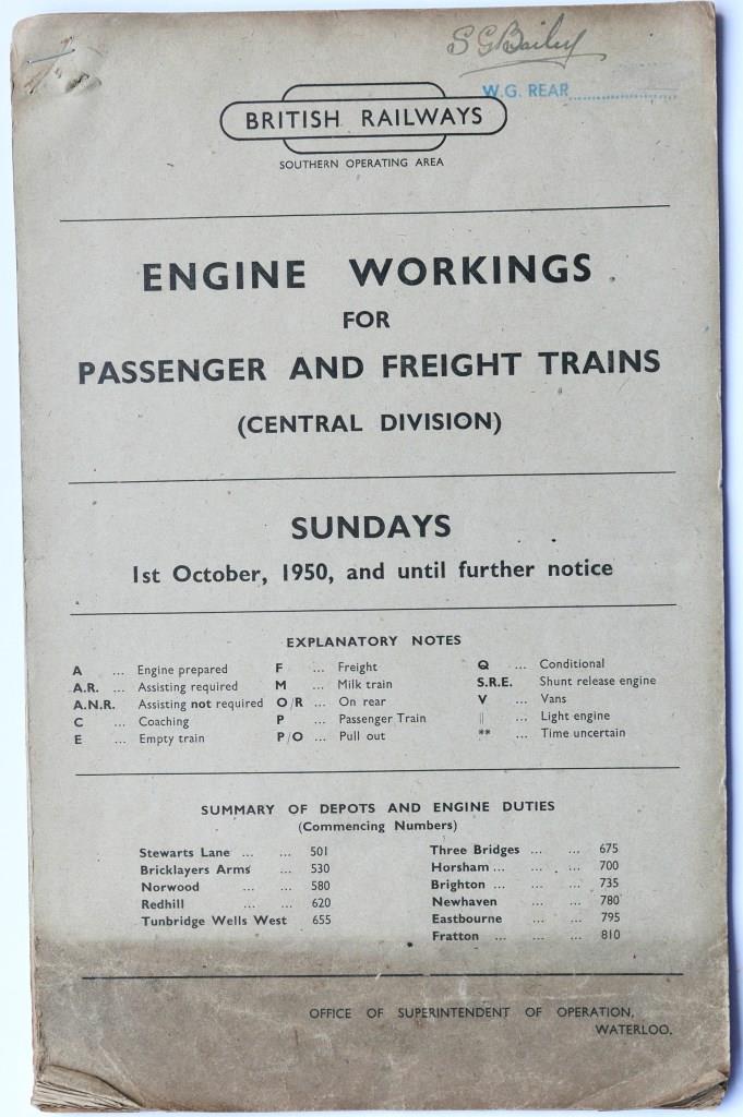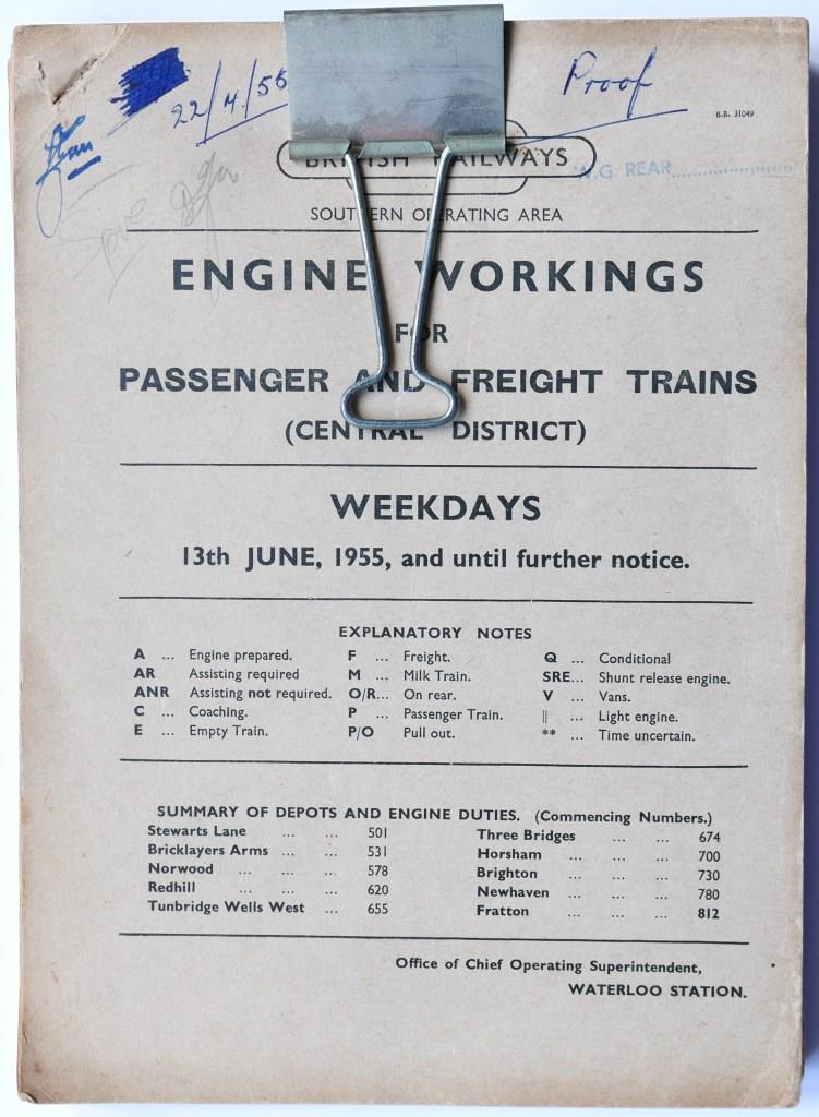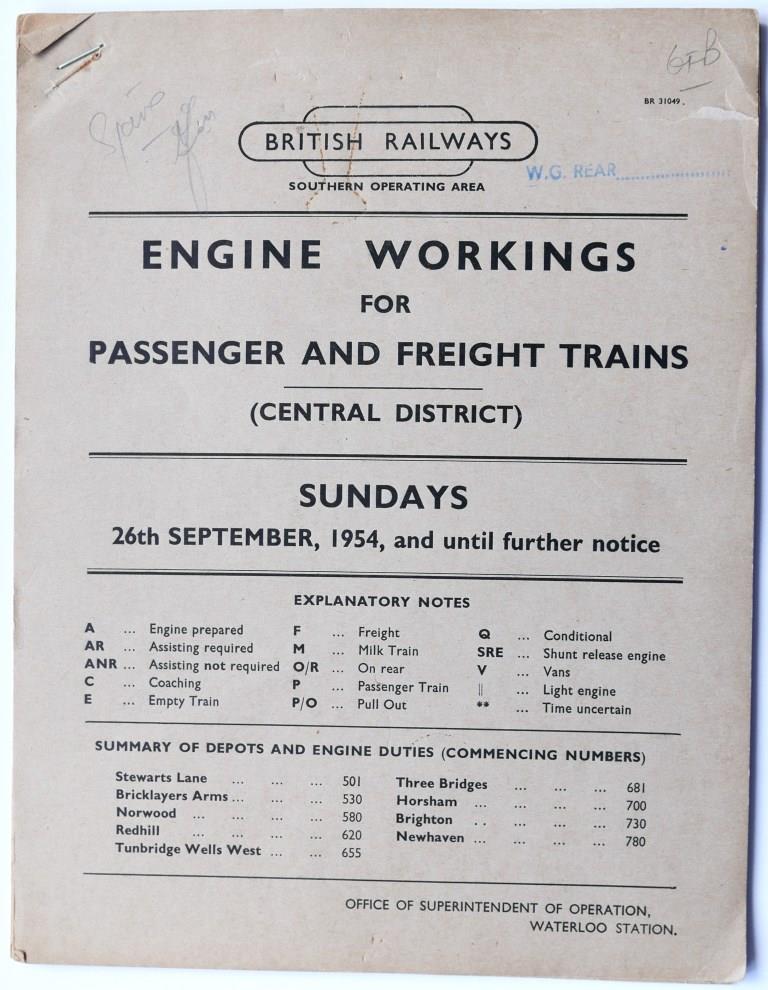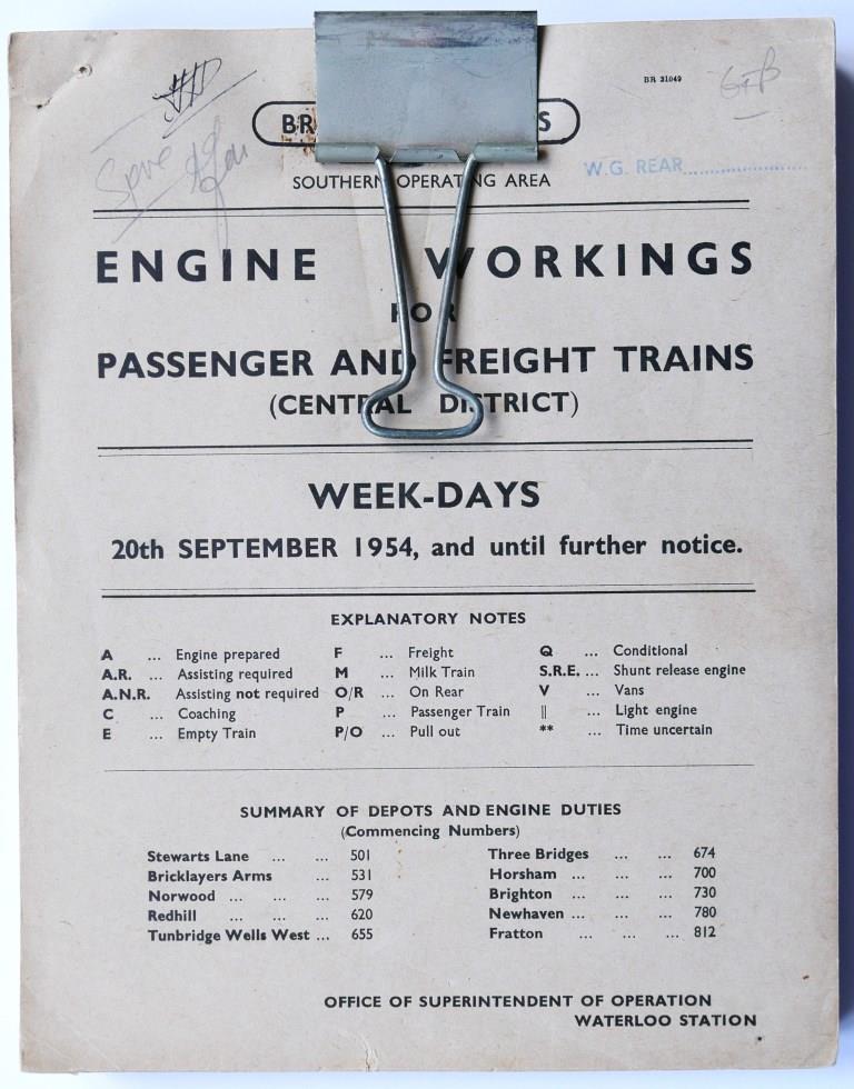 95 | BR(S) Central District booklet ‘Engine Workings for Passenger and Freight Trains – Weekdays’. Card covers, 158pp held by bulldog clip, dated September 1954. | £95 |  |