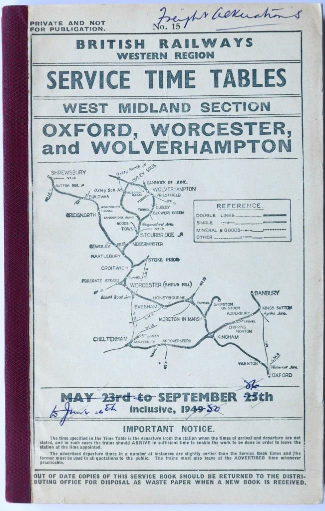 118 | BR(W) West Midland Section No.15 service timetable covering Oxford, Worcester and Wolverhampton. 172pp dated May 1949 (amended to June 1950 – probably a proof copy with amendments throughout). | £12 |  |