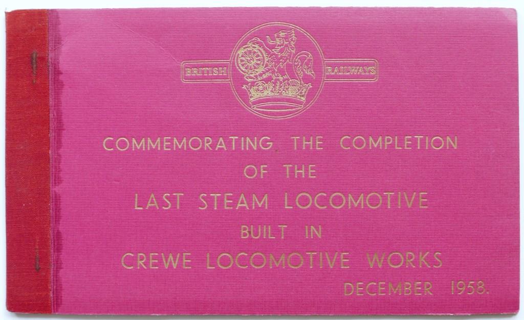 131 | BR(M) commemorative booklet produced for the completion of the last steam loco at Crewe works, December 1958. Red card covers, 20pp including images of locos built at Crewe over the years. Inside front cover signed by various dignitaries including works manager and local mayor. | £19 |  |