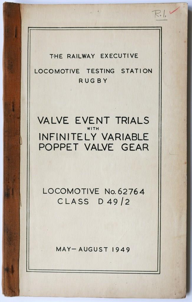 142 | Railway Executive foolscap sized document ‘Report on valve event trials with infinitely variable poppet valve gear on class D49/2 loco 62764’. 33 typescript pages plus tables and charts. Dated May 1949. | £26 |  |