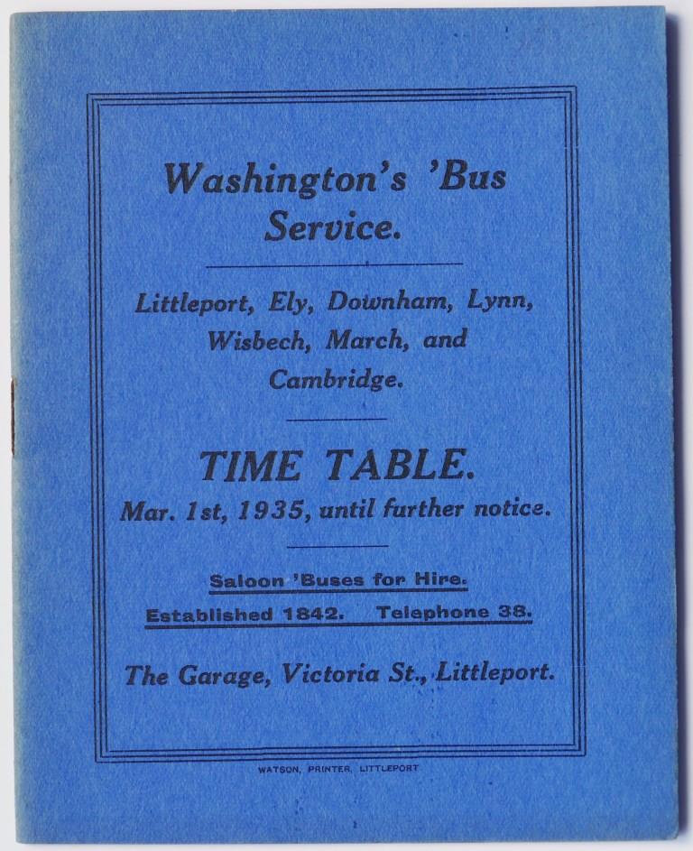156 | Washington’s Bus Service (Littleport) timetable booklet. Blue covers, 16pp dated March 1935. | £11 |  |
