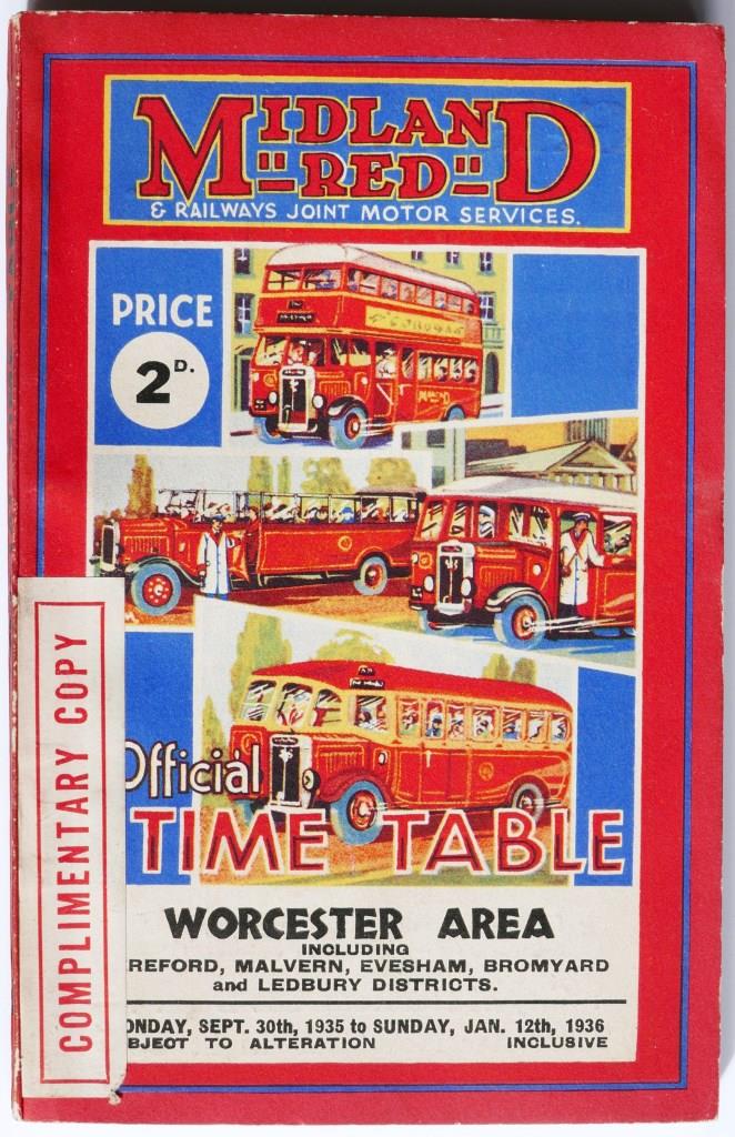 162 | Midland Red timetable booklet for the Worcester Area. Coloured pictorial covers show different types of company buses. 208pp plus map, dated September 1935. | £16 |  |