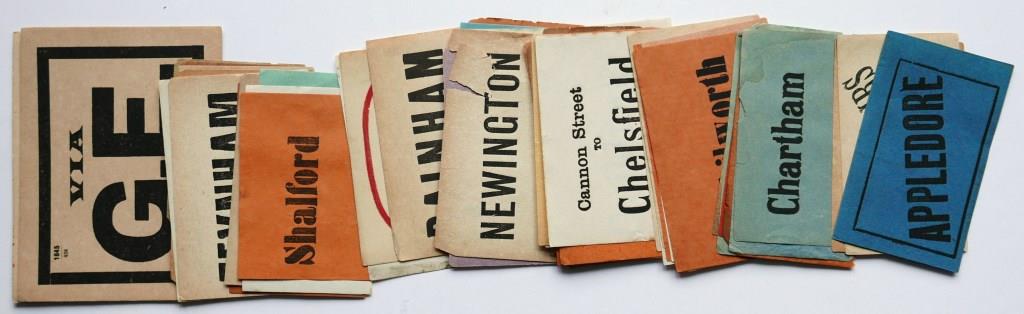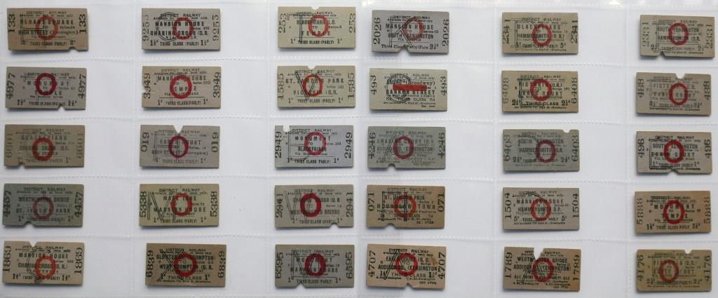 754 | Approx 79 District Railway 3rd class whole Edmondson tickets on lilac coloured card with red ‘O’ overprint. All issued. Back damage to a couple. | £120 |  |