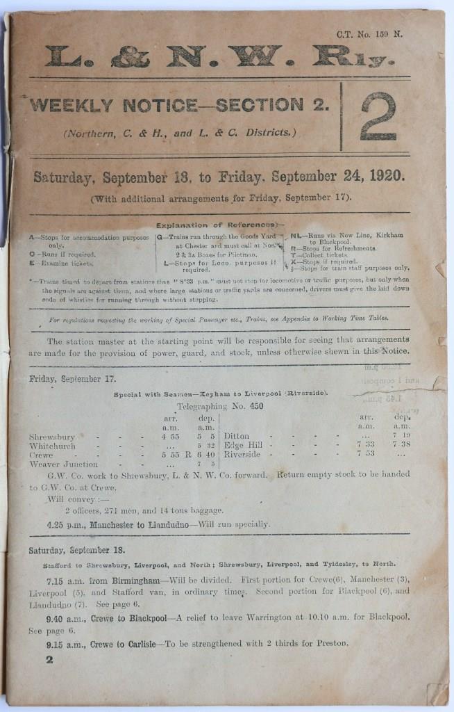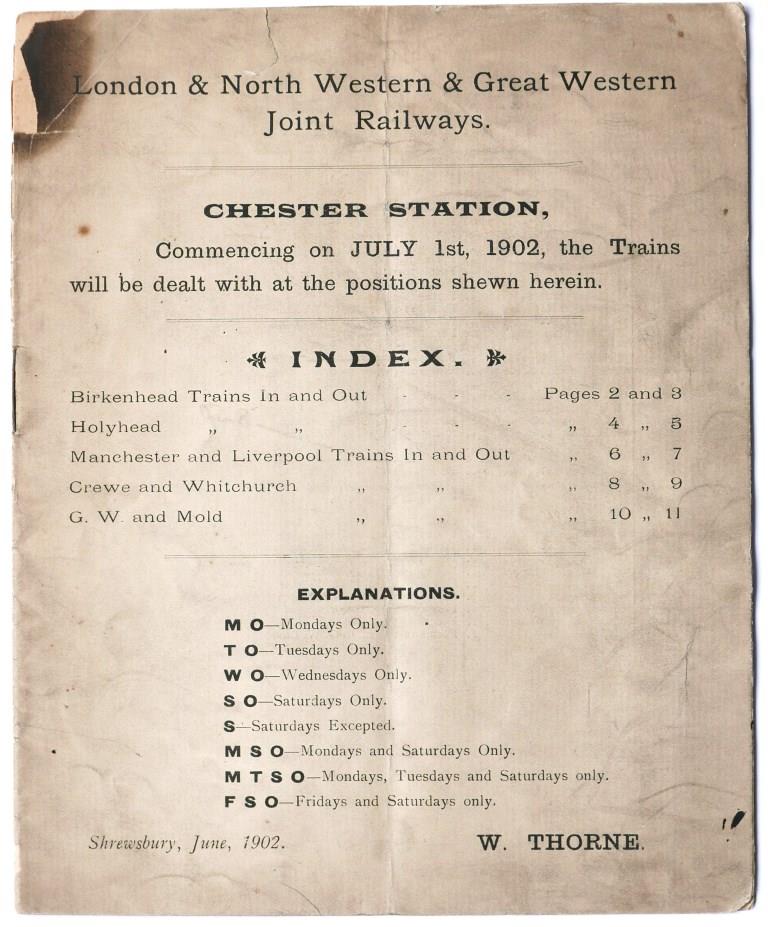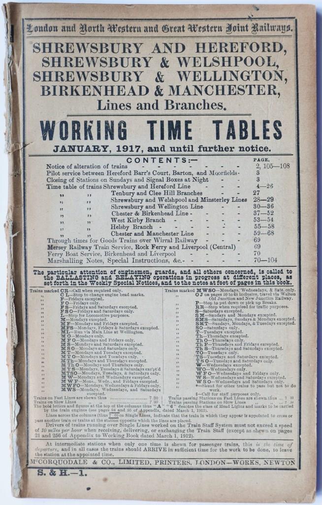 648 | LNWR & GWR Joint Railway working timetable Shrewsbury and Hereford, Shrewsbury & Welshpool, Shrewsbury & Wellington, Birkenhead & Manchester lines and branches. 108pp dated January 1917. Disbound. | £110 |  |