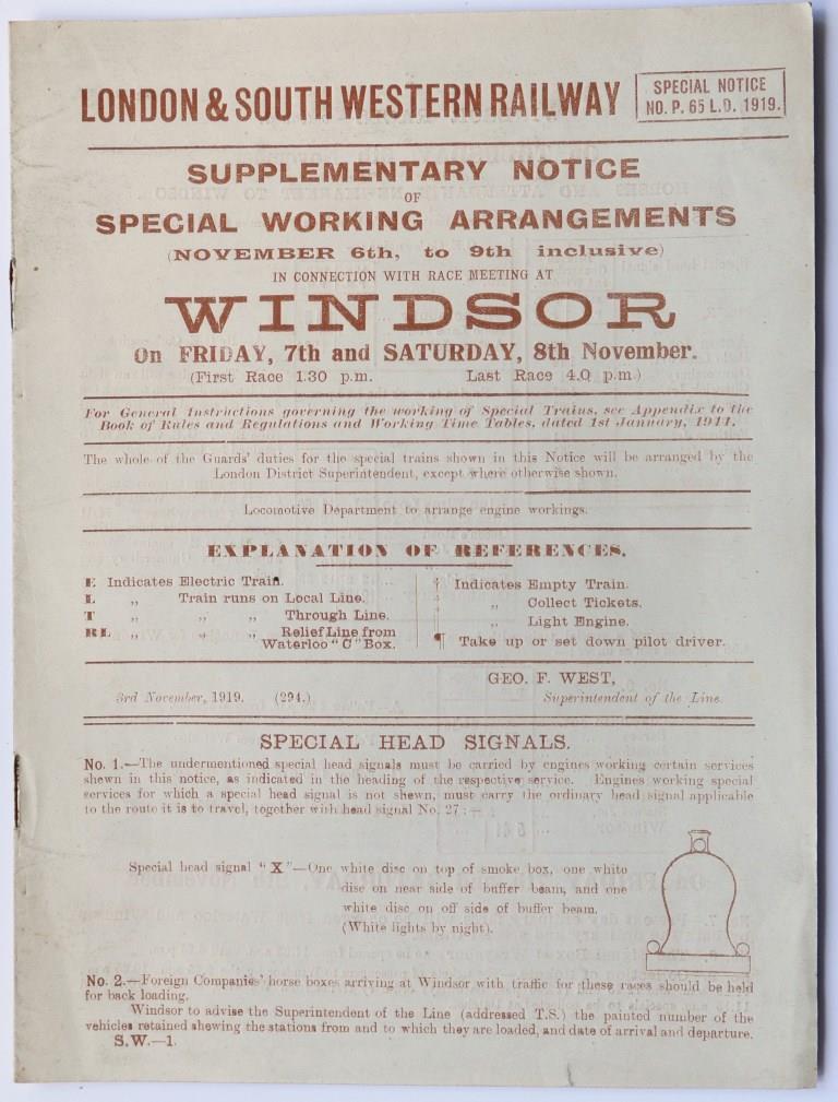 696 | SR London West Division ‘Special Traffic Arrangements’ notice No.90 re Newbury Races. Dated September 1933. 16pp. Plus similar supplement No.1 to the working timetables dated October 1943 (27pp) and passenger and freight train alterations dated November 1945 (12pp). | Not Sold |  |
