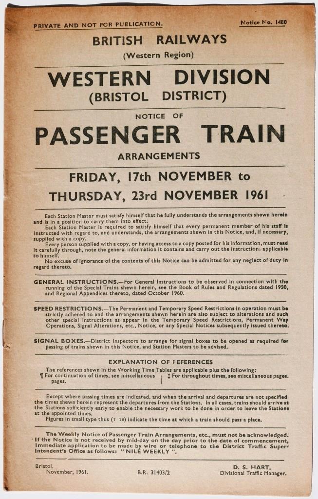 65 | BR(W) Western Division Bristol District Notice No.1480 ’Notice of Passenger Train Arrangements’. 8pp dated 17th November 1961. | £22 |  |
