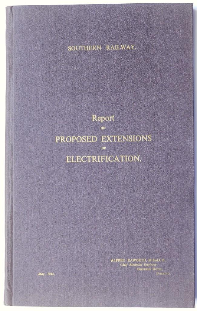 698 | SR report on the ‘Proposed Extensions of Electrification’. Foolscap sized, 22pp plus fold out maps in cloth bound hardback covers with title in gold on front. Dated May 1944. | £10 |  |