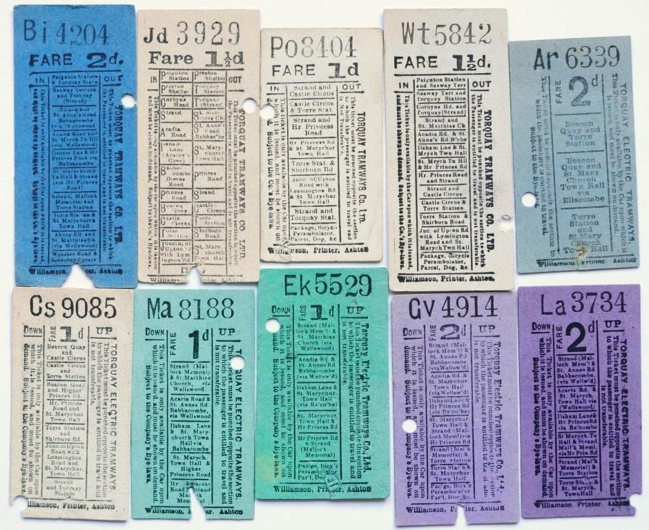 726 | 10 Torquay Electric Tramways Company geographical punch type tickets. 1d, 1½d and 2d values in differing styles. | Not Sold |  |