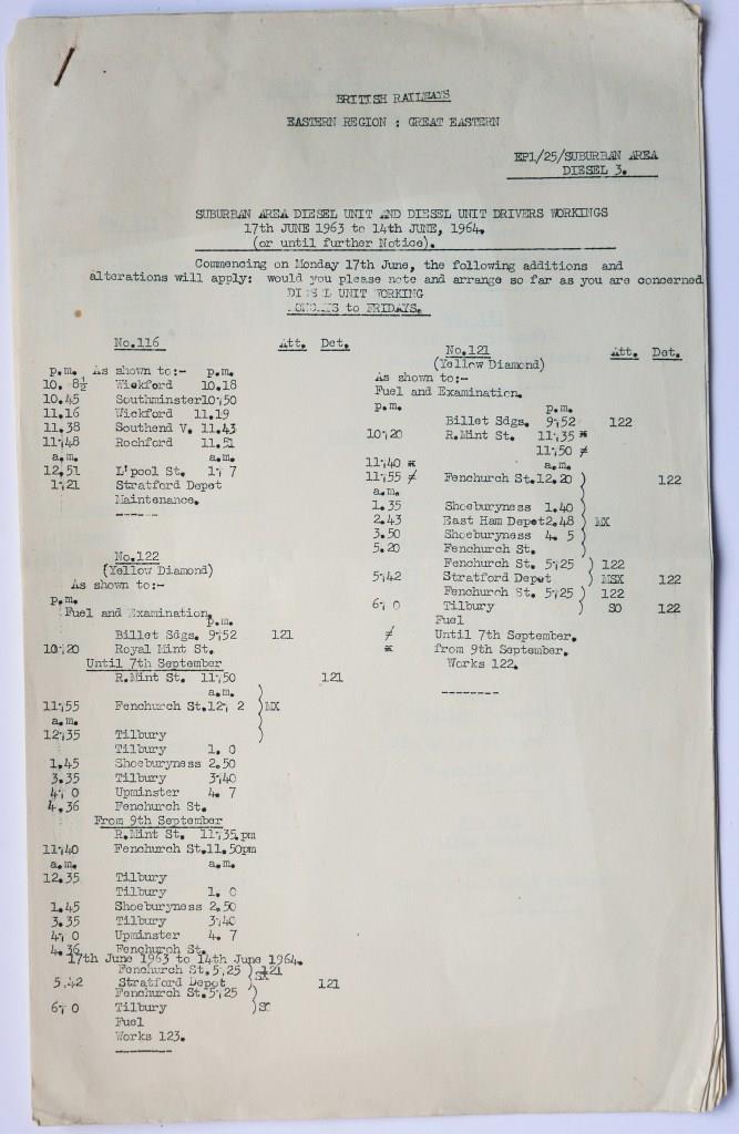 76 | BR(E) Great Eastern 6 typescript page, foolscap sized document ‘Suburban Area Diesel Unit and Diesel Unit Drivers Workings’. Dated June 1963. | £55 |  |