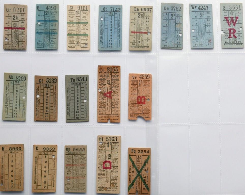 762 | 18 East Ham Corporation Tramways geographical and numerical punch type tickets. No apparent duplication. | £65 |  |