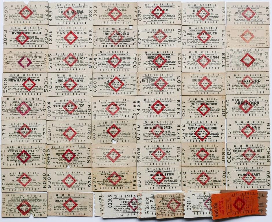 784 | Approx 50 BR Edmondson card red diamond platform tickets and 30 AA type platform tickets. Various regions but many southern noted. Occasional duplication. | £75 |  |