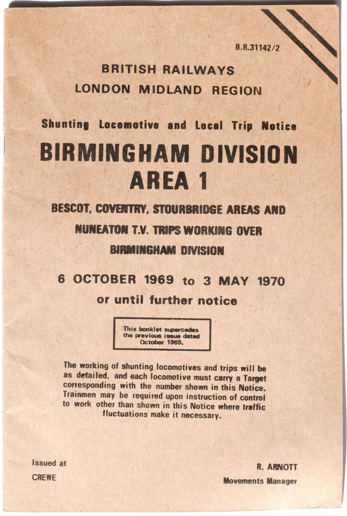 79 | BR(M) booklet ‘Shunting Engine & Local Trip Notice Birmingham Division Area 1 - Bescot, Coventry, Stourbridge, etc’. 35pp dated October 1969. | £22 |  |