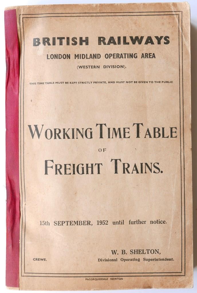 86 | BR(M) Western Division sections 1 - 11 and 13 working timetable of freight trains. 700+pp dated September 1952. Rusty staples. | £85 |  |