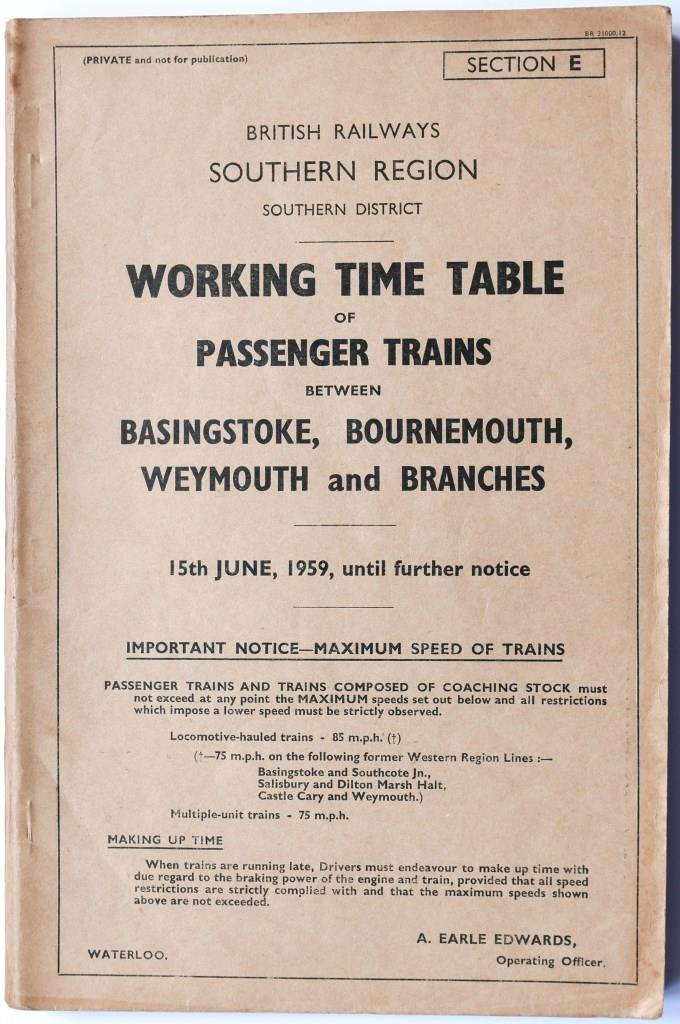 93 | BR(S) Southern District section E working timetable of passenger trains between Basingstoke, Bournemouth, Weymouth & Branches. 257pp dated June 1959. | £28 |  |
