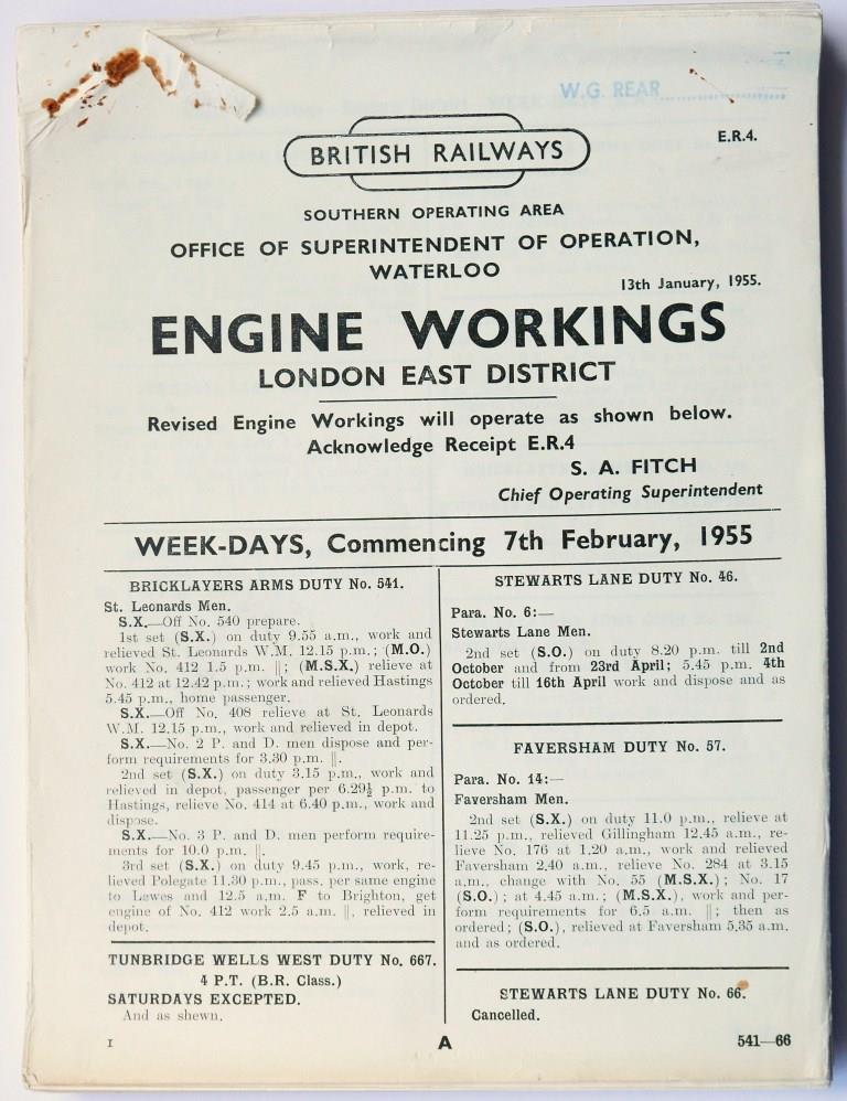 96 | BR(S) London East District booklet of revised engine workings for weekdays. 100+pp dated February 1955. Staple removed. | £95 |  |