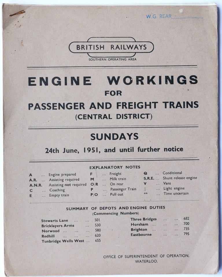 97 | BR(S) Central District booklet ‘Engine Workings for Passenger and Freight Trains – Sundays’. Card covers, 28pp, dated June 1951. | £5 |  |