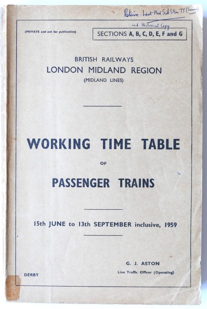58 | BR(M) Midland Lines sections A - G working timetable of passenger trains. 400+pp, dated June 1959. | £36 |  |