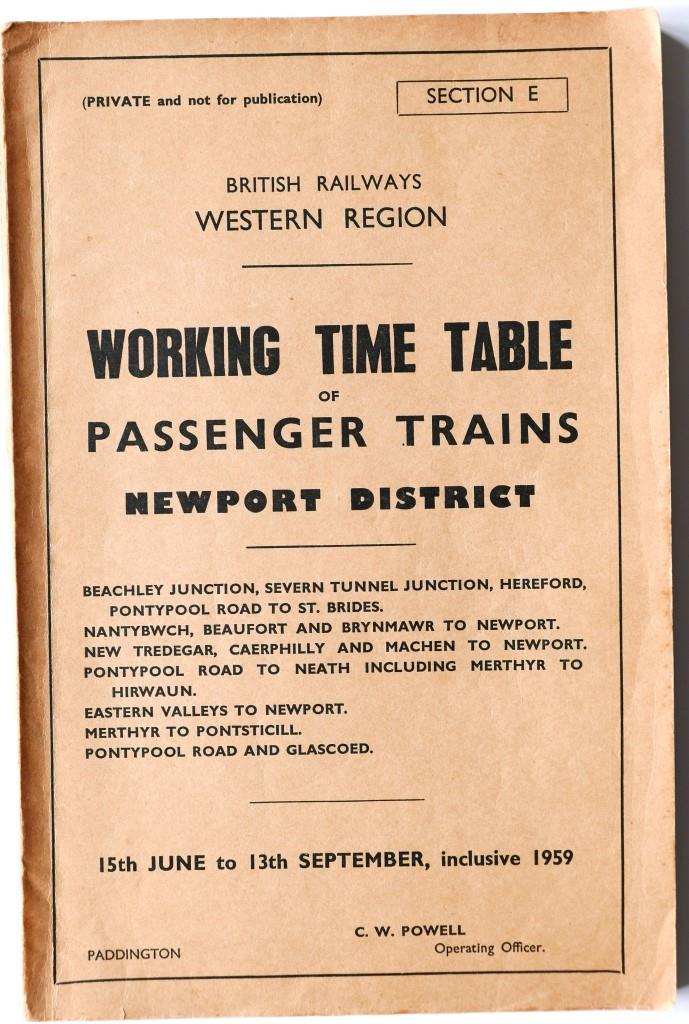 63 | BR(W) section E working timetable of passenger trains Newport District. 172pp, dated June 1959. | £38 |  |