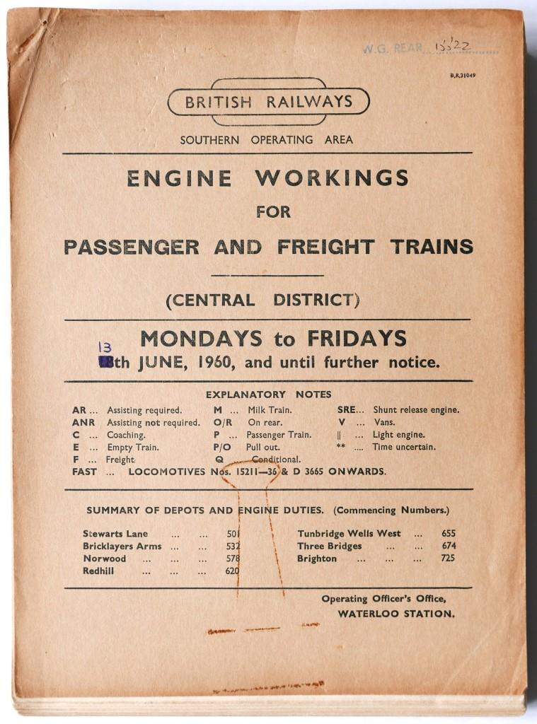 69 | BR(S) Central Division booklet ‘Engine Workings for Passenger and Freight Trains – Weekdays’. Card covers (rear missing), 162pp dated June 1950. Cover worn, staple removed. | £110 |  |