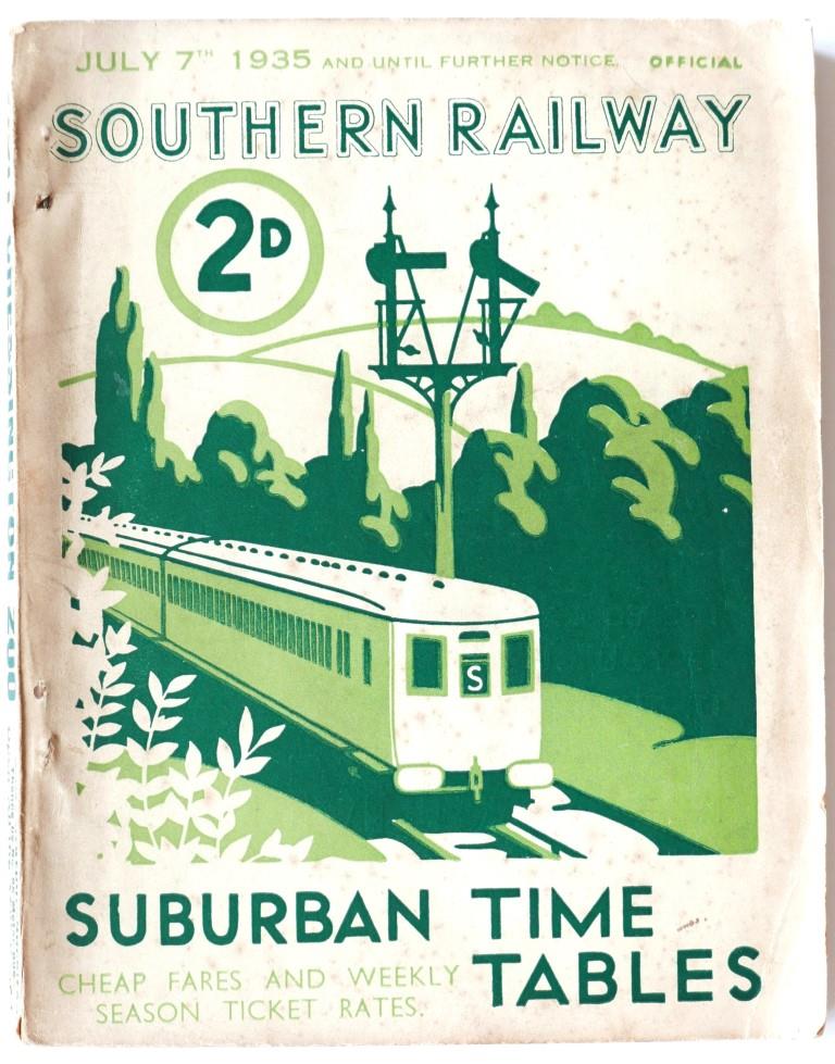687 | SR public timetable booklet for suburban services. Two tone green illustrated covers showing EMU and signals, 208pp, dated July 1935. | £65 |  |