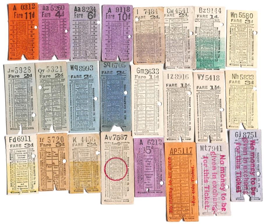 723 | 24 Torquay Tramways Company geographical and numerical punch type tickets. Values up to 11d. Some duplication. | £36 |  |