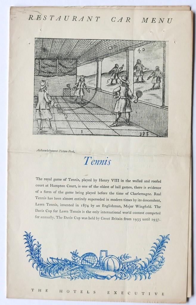 74 | Hotels Executive Restaurant Car Service 4pp menu for a special car in connection with the ship SS Ile de France on 22nd May 1952. Front shows illustration of the game of tennis. Horizontal fold. | £55 |  |
