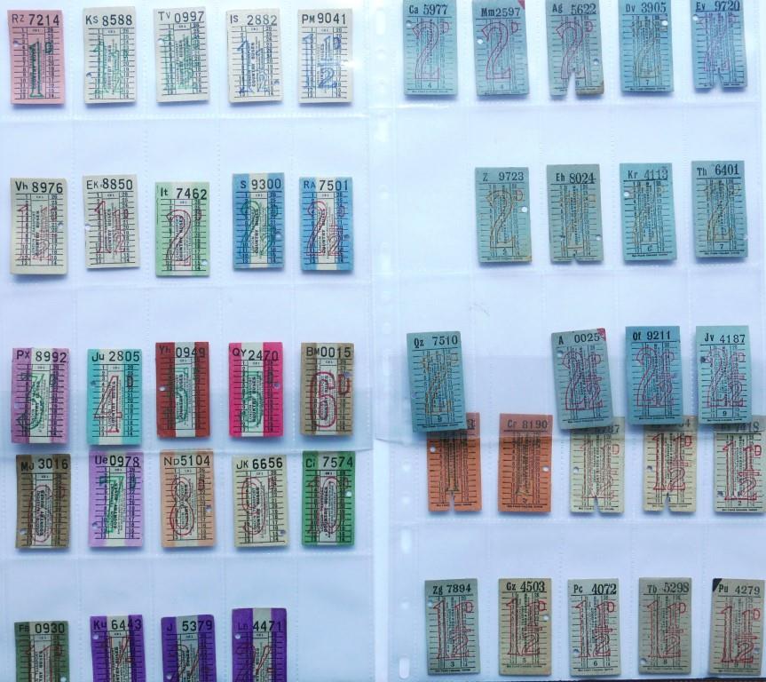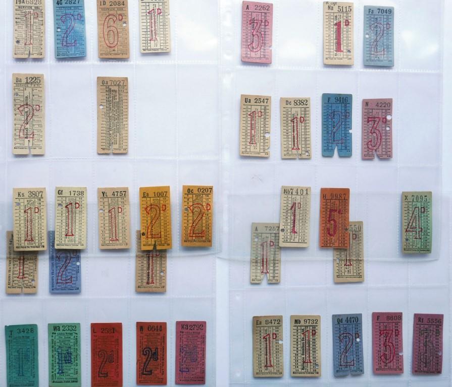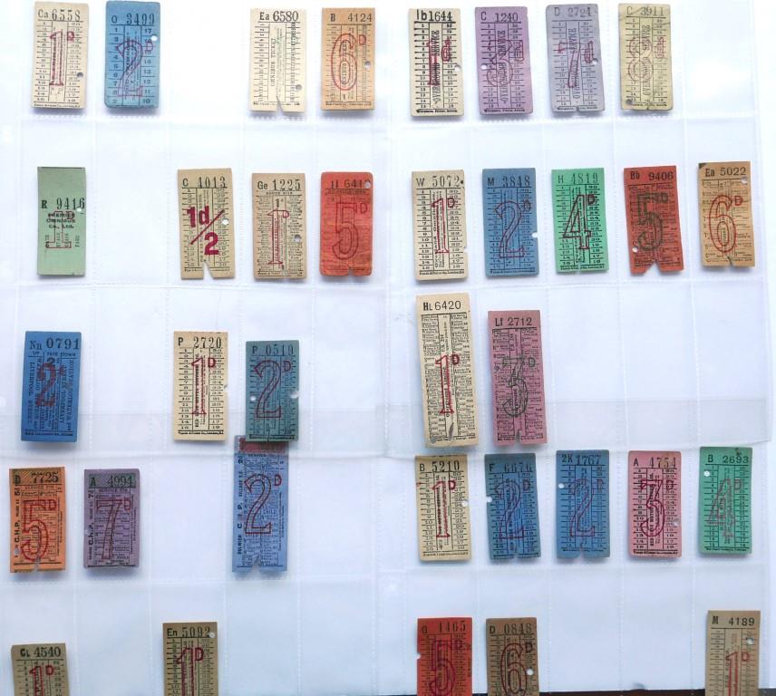 732 | Approx 120 LT Trams 2d, 2½d and 3d geographical punch type tickets with coloured bands down the left and right edges. Variety of routes, no apparent duplication. | £75 |  |